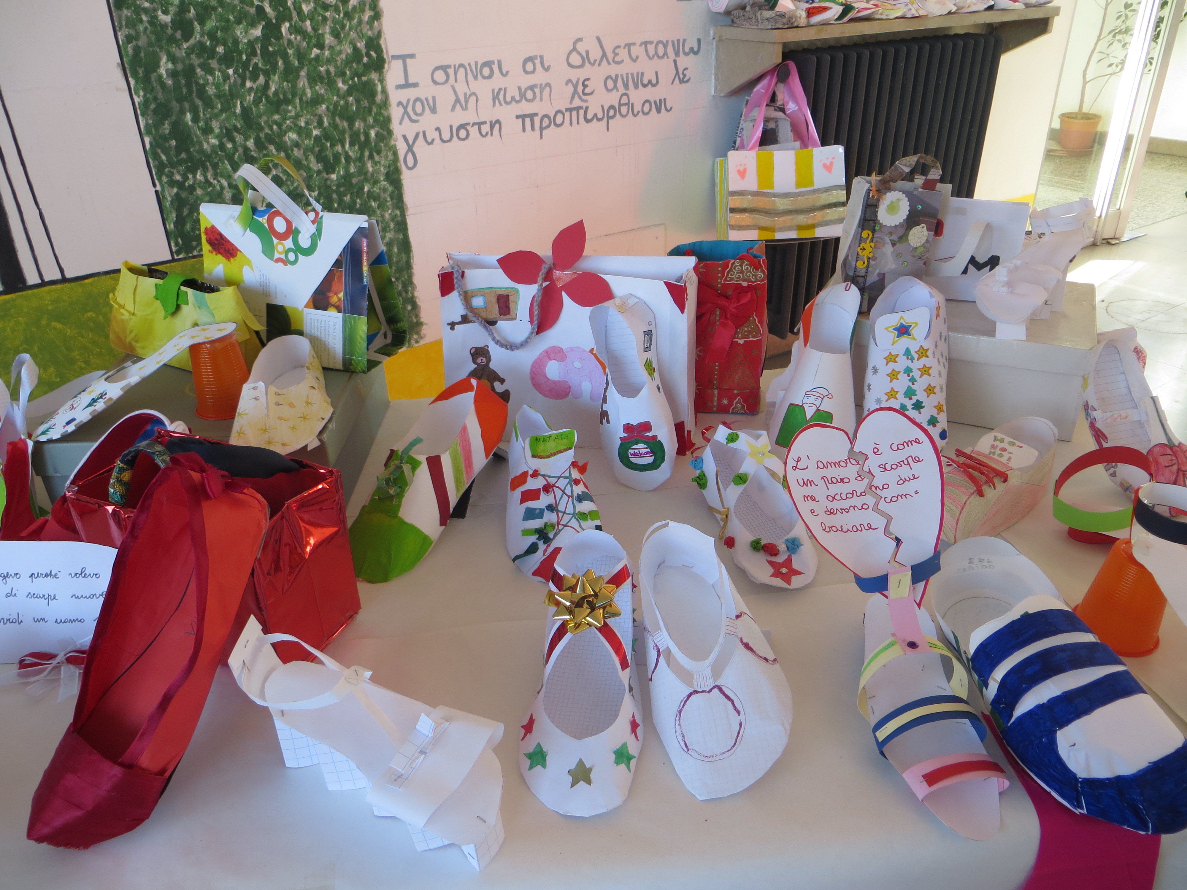 Queste scarpe e borse verranno prossimamente esposte nell’atrio della scuola, dove precedentemente sono stati esposti i burattini, in modo che ognuno le possa ammirare.