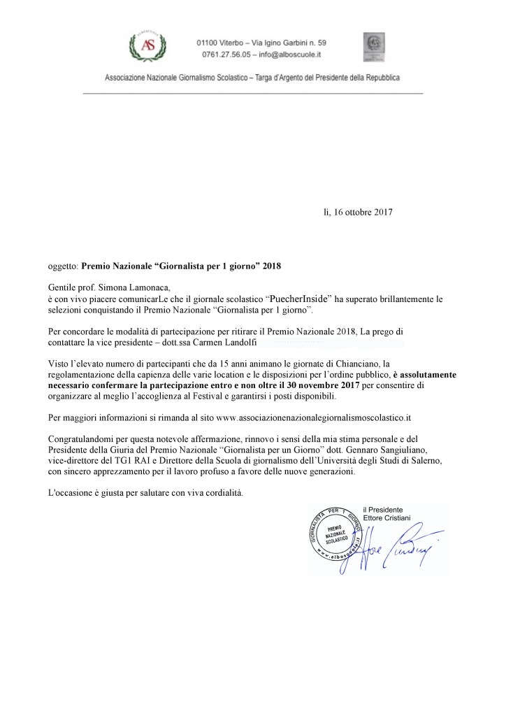 Il dottor Gennaro Sangiuliano , vice-direttore del TG1 RAI e Direttore della Scuola di giornalismo dell’Università degli Studi di Salerno ci ha comunicato che il blog della nostra scuola ha vinto il premio nazionale “Giornalista per 1 giorno” 2018″, promossodall’associazione Alboscuola, che prende in considerazione tutte le attività giornalistiche in tutti gli ordini di scuola in Italia