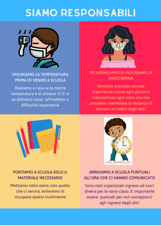 Al momento della merenda, prima di toccare il cibo, ci si igienizzano le mani, si mangia sempre da seduti e chi non fa merenda esce dalla classe. Non si può prestare niente, specialmente la merenda. In bagno si va uno per uno e quando si torna ci si igienizzano ancora le mani e non si fa mai assembramento. I banchi sono tutti distanziati di un metro l’uno dall’altro. Ovviamente abbiamo tutti la mascherina. I rientri pomeridiani sono divisi in giorni: il lunedì e il mercoledì ci sono le prime, il giovedì le seconde, mentre le terze quest’anno non ne fanno. In mensa siamo divisi in quattro per ogni tavolo, ovviamente con la distanza di un metro l’uno dall’altro e ancora ovviamente prima di mangiare ci si igienizzano le mani e lo si fa anche dopo aver finito.