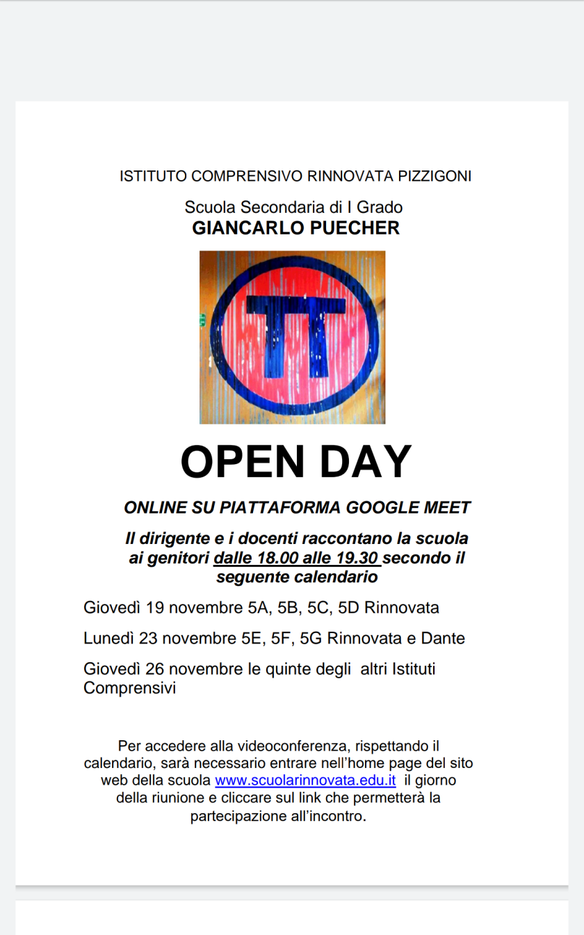 La scuola infatti si presenterà ai genitori degli alunni delle quinte elementari in tre date: il 19, il 23 e il 28 novembre, ma lo farà online dalle 18 alle 19 30, per accedere agli incontri bisognerà cliccare sul link che apparirà sul sito della scuola i giorni delle date previste. Il primo appuntamento sarà per le Quinte A, B, C e D Rinnovata, il secondo appuntamento sarà per le Quinte E, F e G Rinnovata e Dante e il terzo appuntamento per alunni di altri istituti primari.