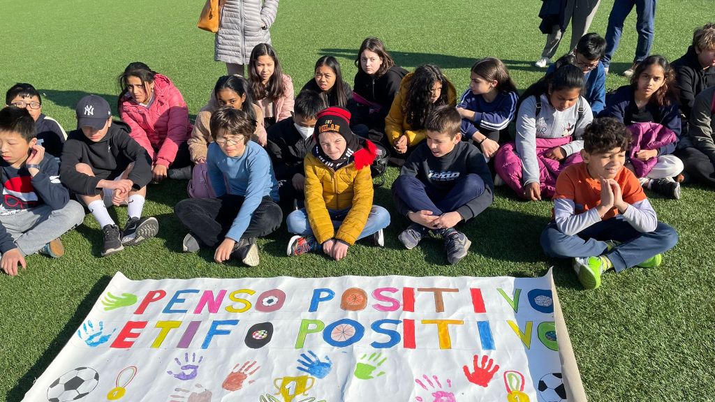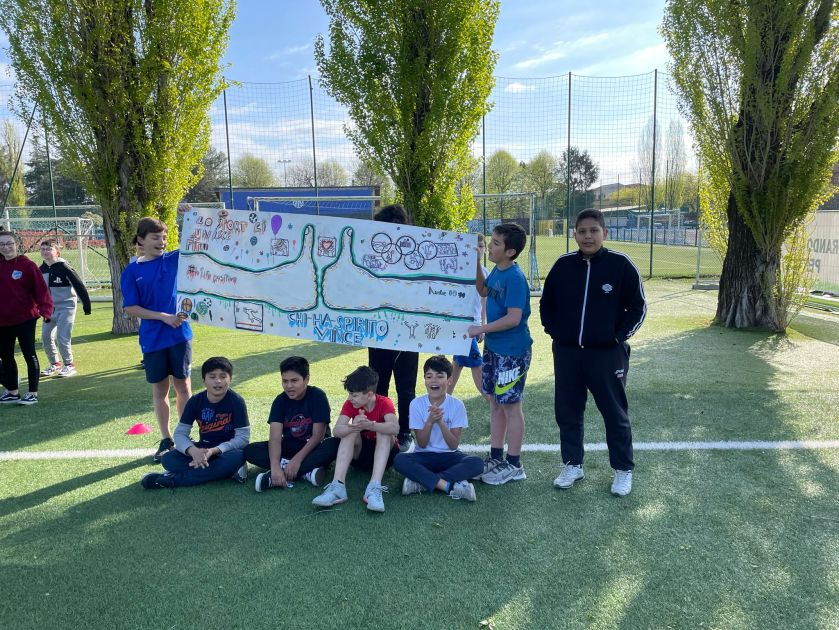 Tutte le classi si sono dirette verso metà campo dove hanno messo in bella mostra i loro striscioni realizzati in classe.
