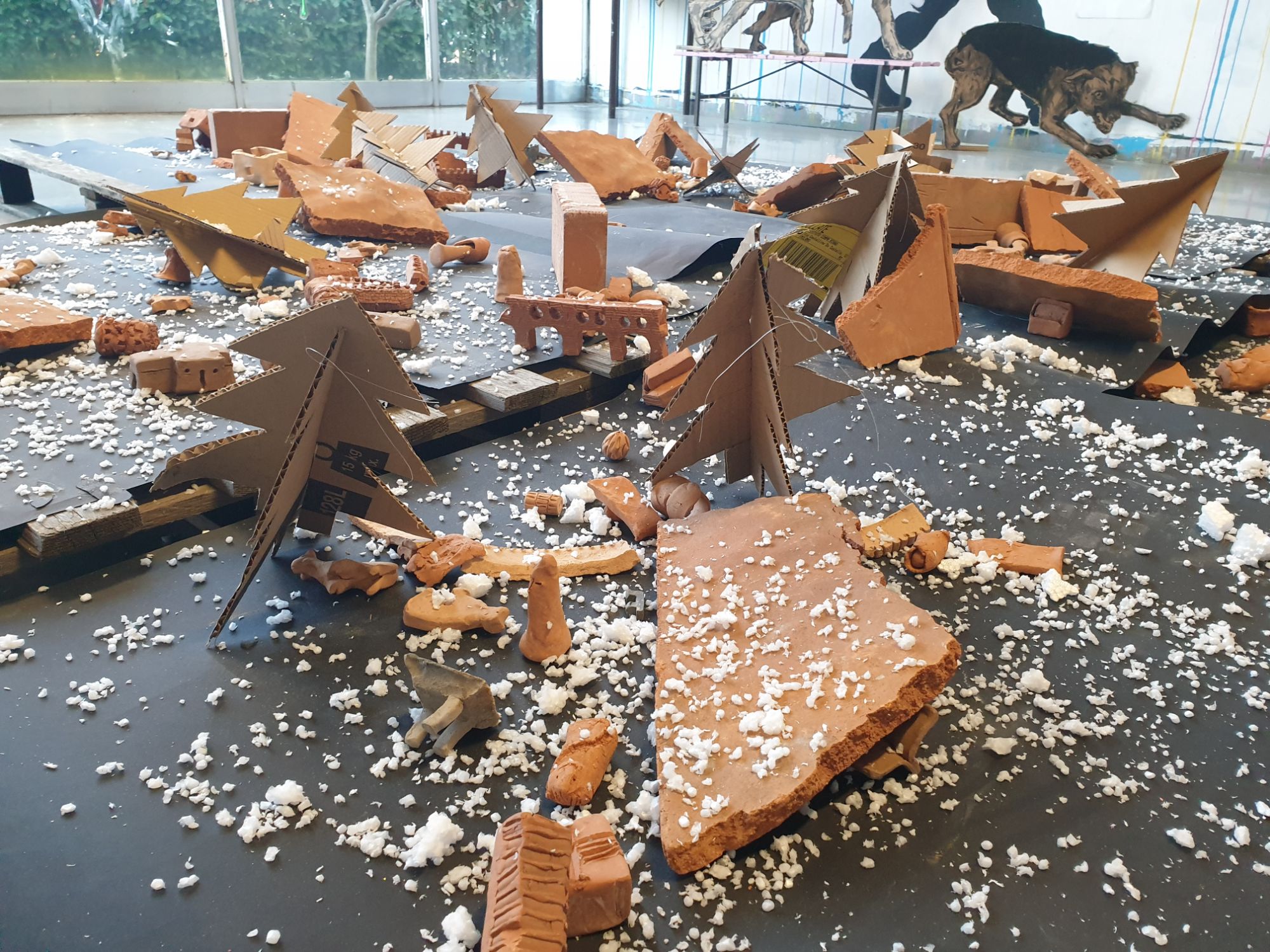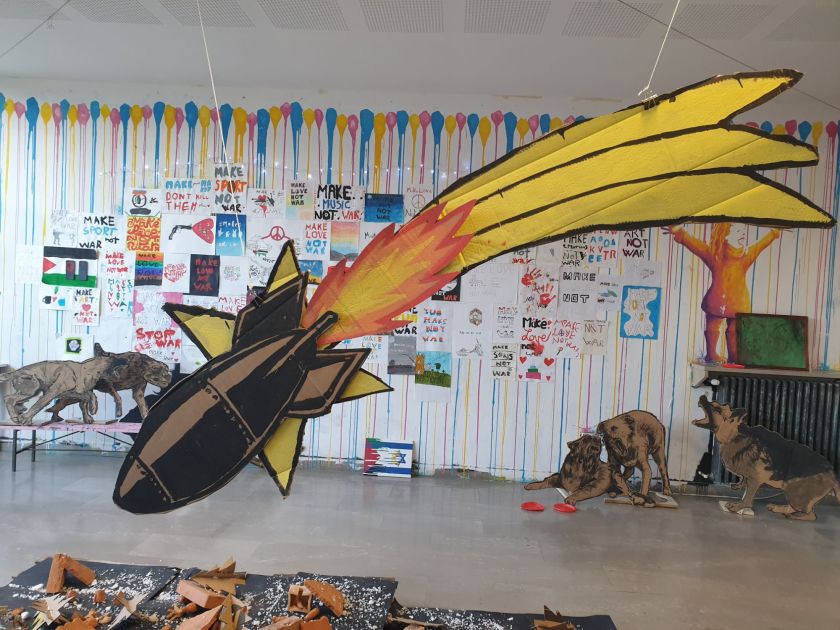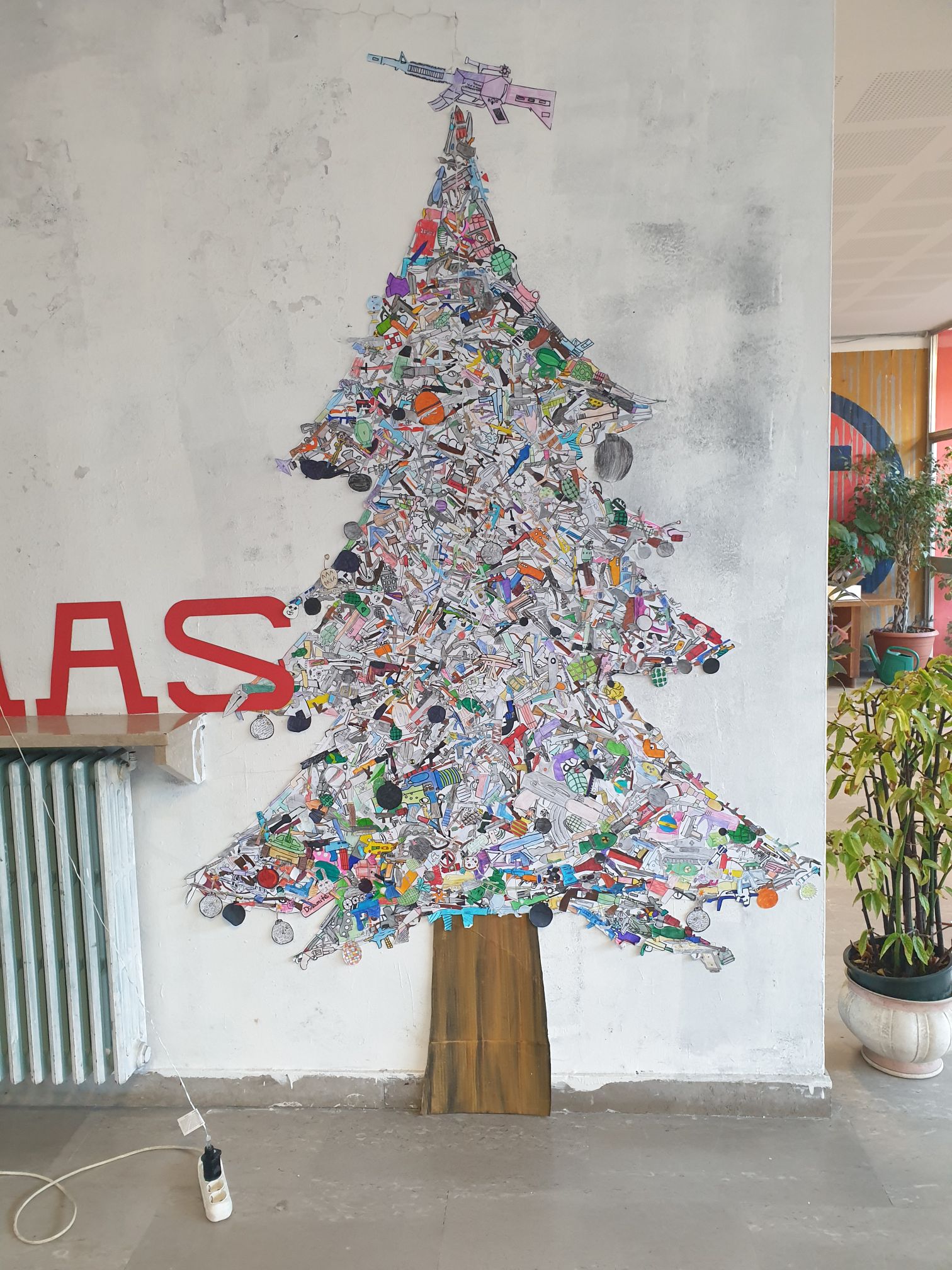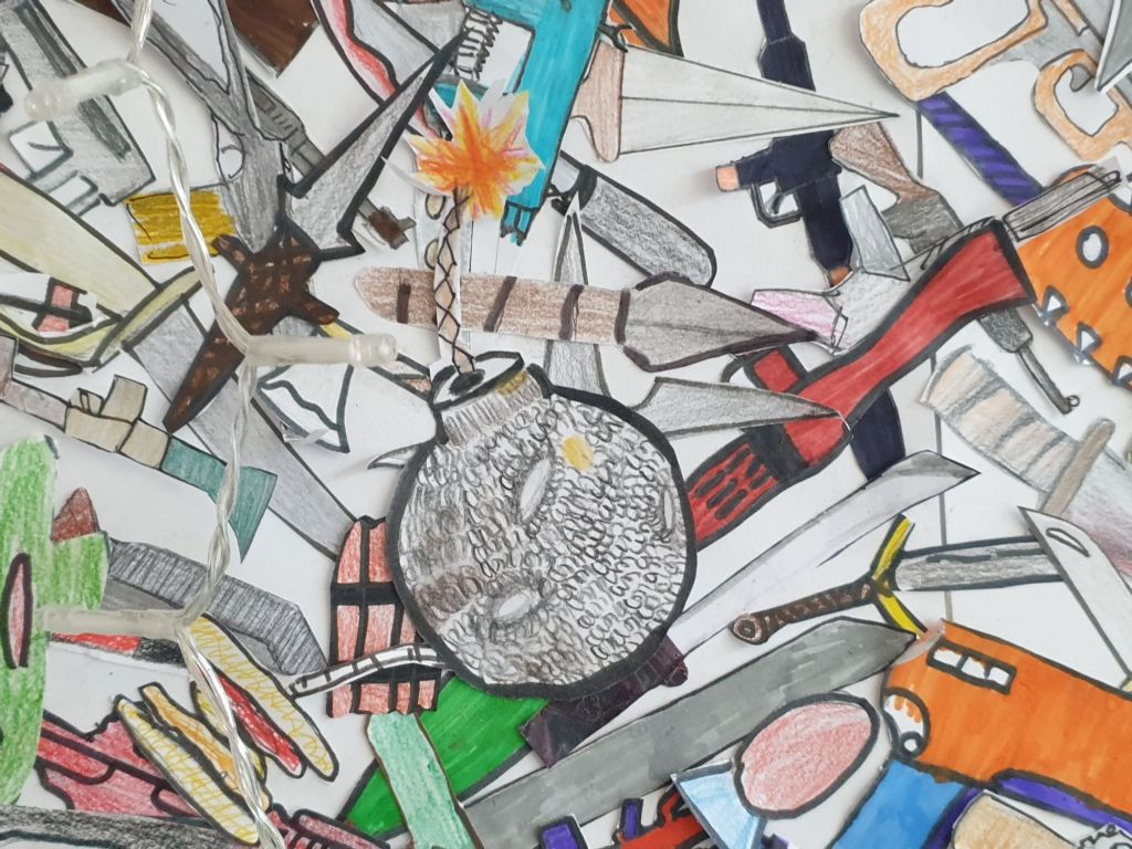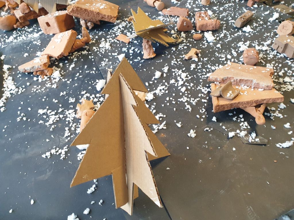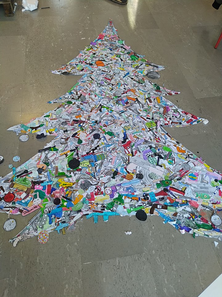 In occasione di Natale, il Prof. Gurreri e la Prof. Lezzi con l’aiuto degli alunni hanno realizzato non il solito presepe, bensì un’installazione per ricordare la guerra e tutte le persone che la stanno vivendo. Hanno infatti realizzato un plastico di Gerusalemme che viene distrutta da una bomba a mo’ di stella cadente, non solo… hanno anche realizzato un albero di Natale fatto in carta e con sopra raffigurate tante, anzi tantissime, armi .